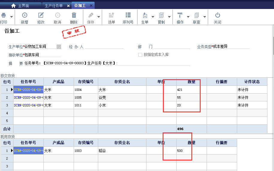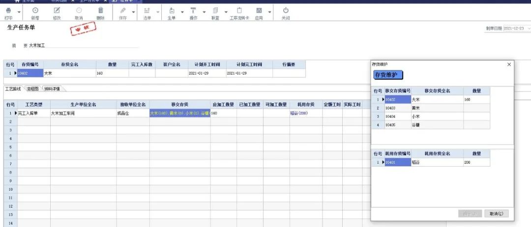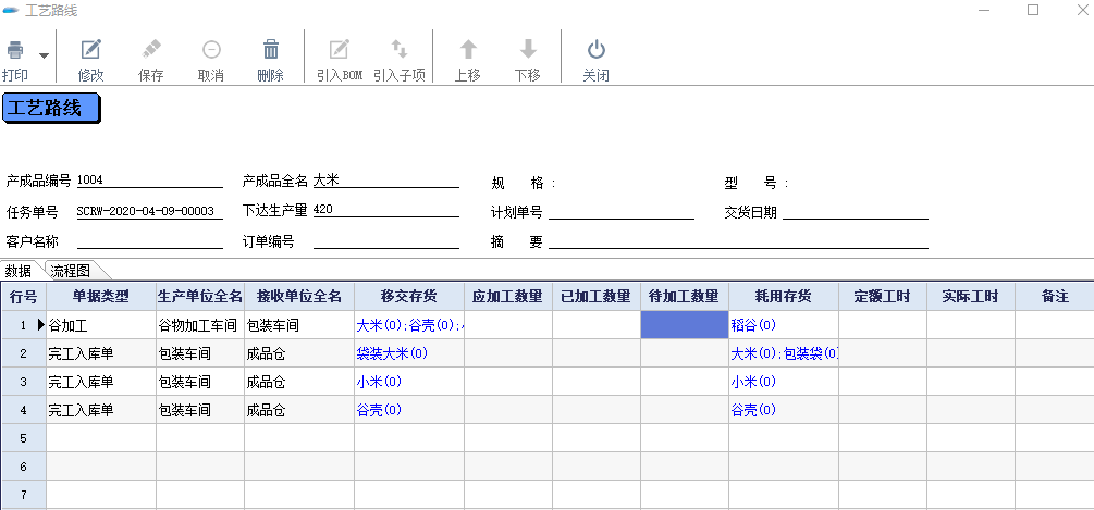 ① 稻谷加工:在生產(chǎn)之前應(yīng)當(dāng)首先下達生產(chǎn)任務(wù)單,大概知道出產(chǎn)多少大米(不需要精準(zhǔn)的數(shù)據(jù)量),因為在生產(chǎn)過程中會產(chǎn)生副產(chǎn)品例如小米、谷糠等物, 因此用量多少往往是確定的,而對于產(chǎn)出物的多少卻并不清楚。因此在這一過程中設(shè)置工藝路線產(chǎn)出物時應(yīng)該設(shè)置為不固定比例產(chǎn)出。