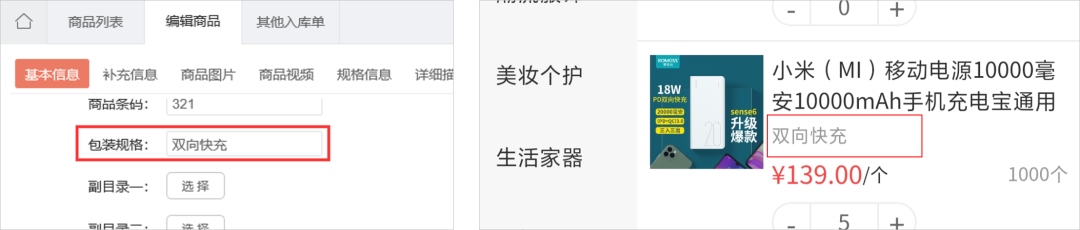 支持商品編輯字段【包裝規格】,展示在前端商品列表頁。