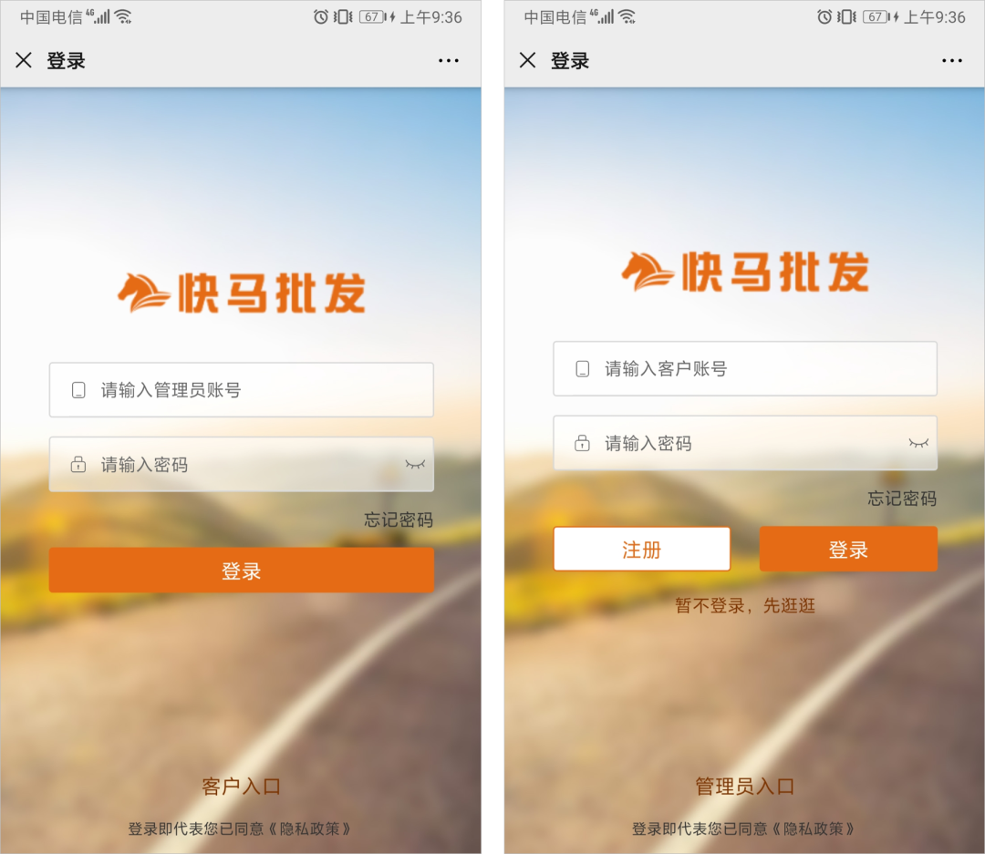 在后臺設置中,添加員工賬號時,為其標記為業務員后,該角色即創建成功。此后,所有端口管li員、業務員登錄端口統一,登錄操作不再做區分。不同身份在登錄界面切換“管li員/客戶”入口即可。并且此后不再有快馬pi發APP,快馬業務員APP,統一為一個快馬APP。