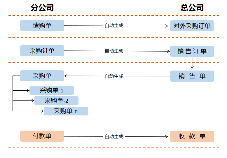 3、總部集中采購模式:分公司向總部發(fā)起采購申請,總部集中采購,然后分撥給各分支機構(內部進行結算)。系統(tǒng)上需實現(xiàn)分支機構的請購單能自動流轉至總部并生成采購訂單,同時實現(xiàn)分支機構和總部之間的內部采購銷售協(xié)同。